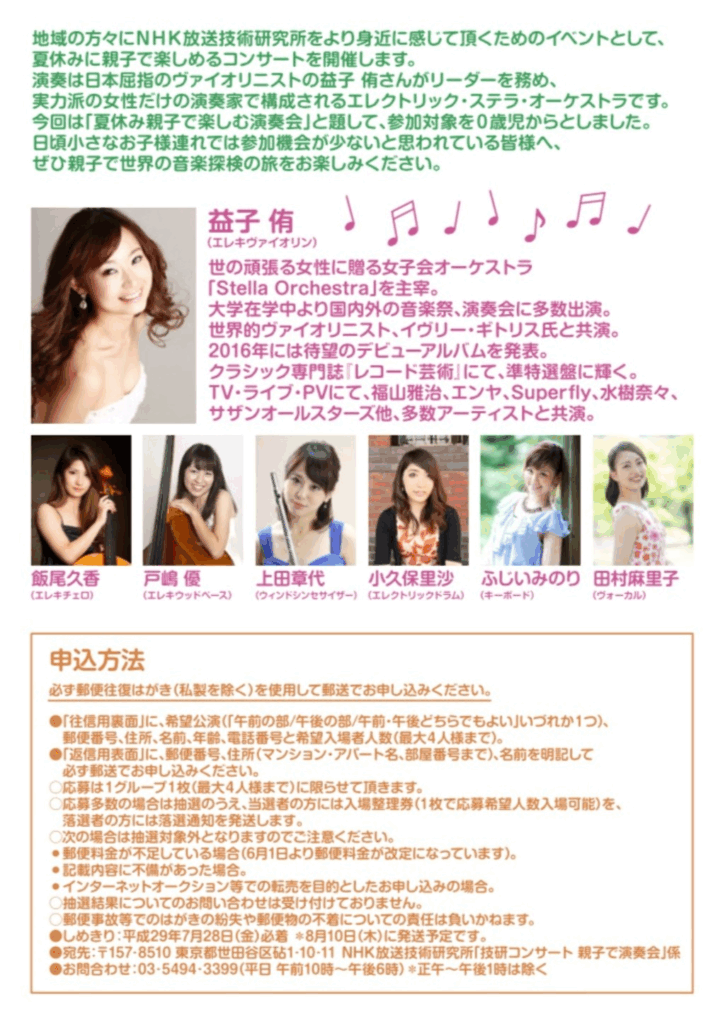 地域の方々にNHK放送技術研究所をより身近に感じていただくためのイベントとして、夏休みに親子で楽しめるコンサートを開催します。演奏は日本屈指のヴァイオリニストの益子侑さんがリーダーを務め、実力派の女性だけの演奏家で構成されるエレクトリック・ステラ・オーケストラです。今回は「夏休み親子で楽しむ音楽会」と題して、参加対象を0歳児からとしました。日頃小さなお子様連れでは参加機会が少ないと思われている皆様へ、ぜひ親子で世界の音楽探検の旅をお楽しみください。